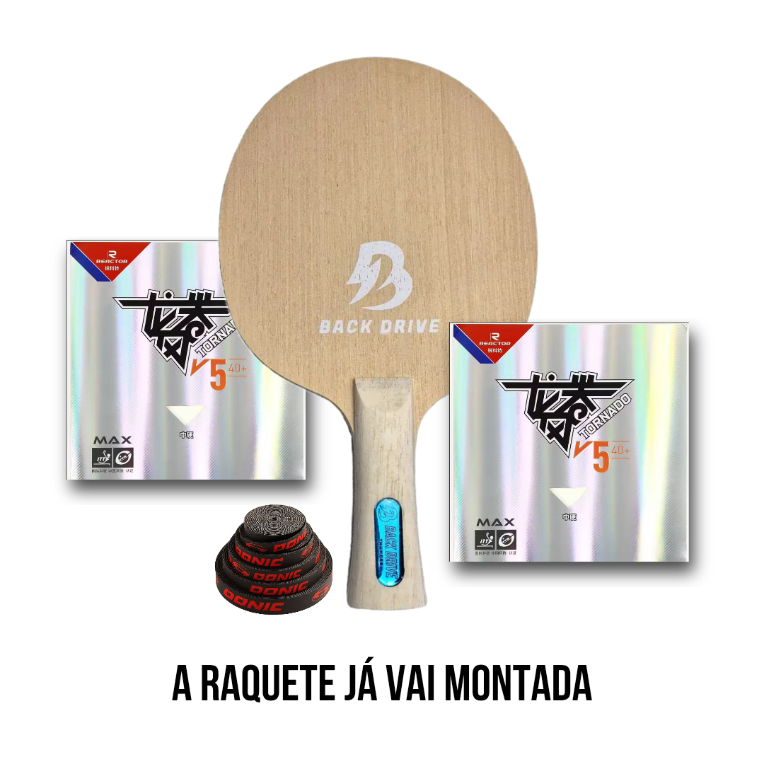 Este conjunto combina a madeira Backdrive Thunder, um projeto exclusivo de 7 camadas All Wood desenvolvido para máxima velocidade com precisão, com duas borrachas Reactor Tornado V5 40+, conhecidas pelo excelente equilíbrio entre efeito, controle e resposta elástica.